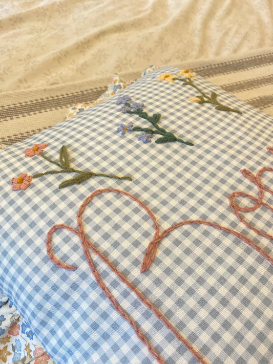 Blue Gingham Embroidered Cushion with Floral Trim
