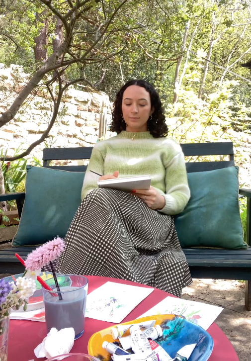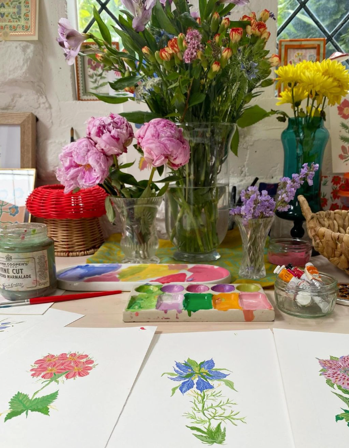 With her studio in her grandparents garden, it’s the perfect backdrop for painting her floral artworks.