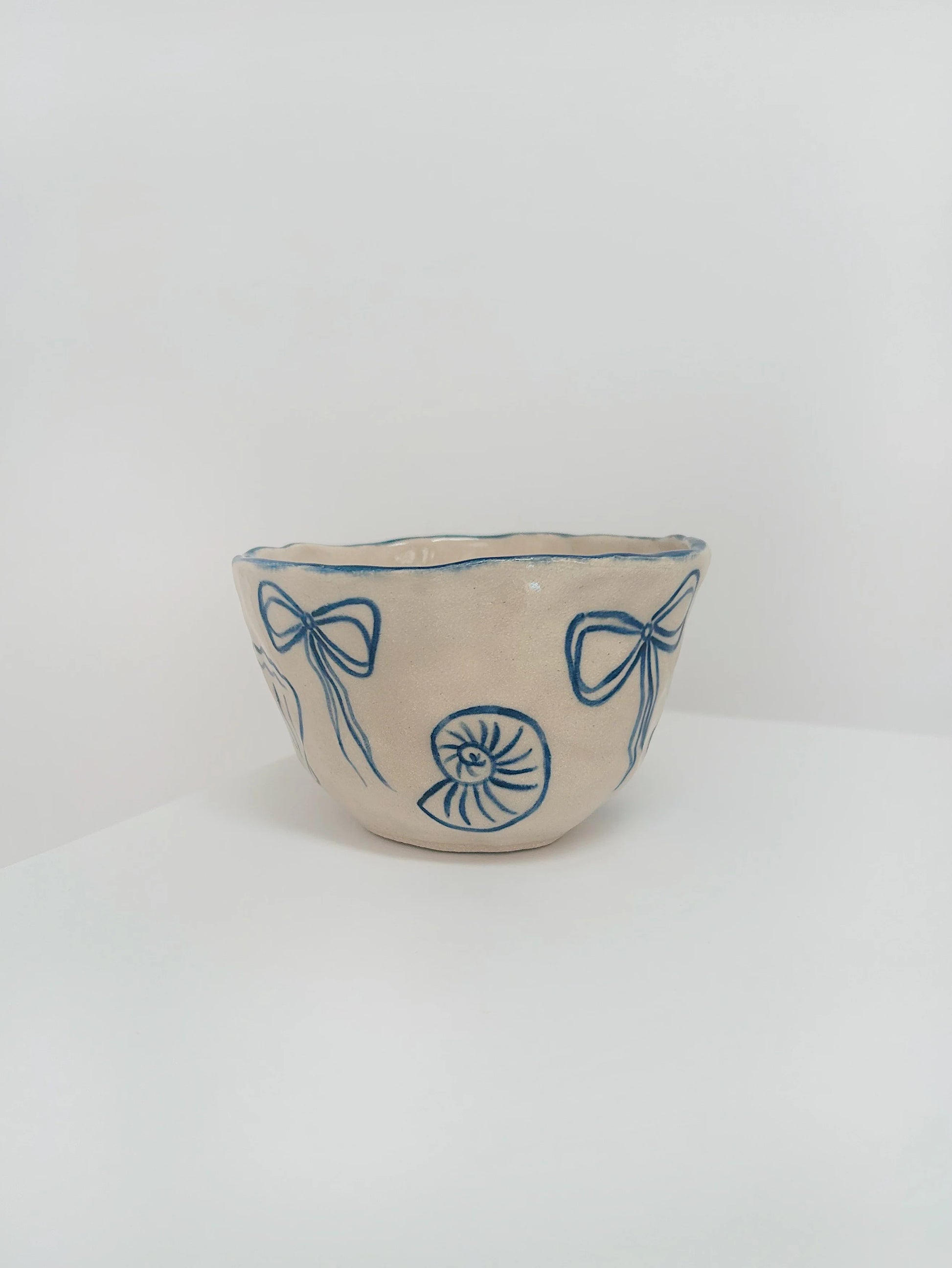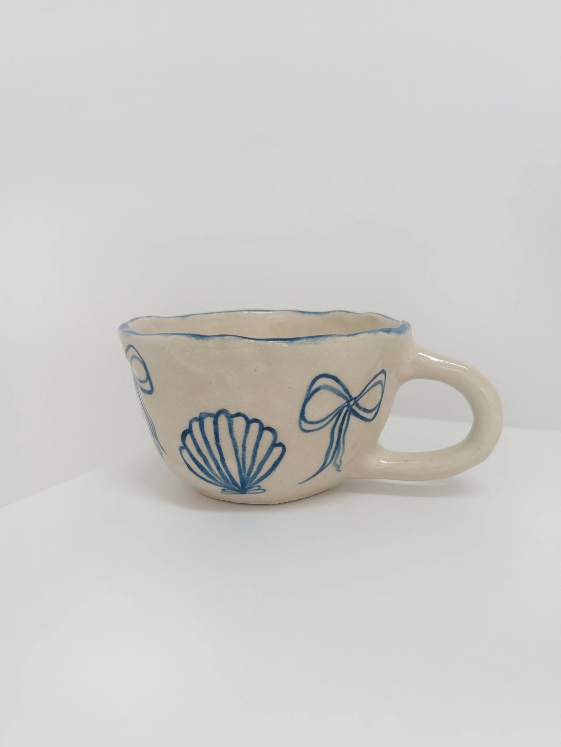 A hand-pinched stoneware coffee cup with a selection of hand-illustrated seashells and bows.